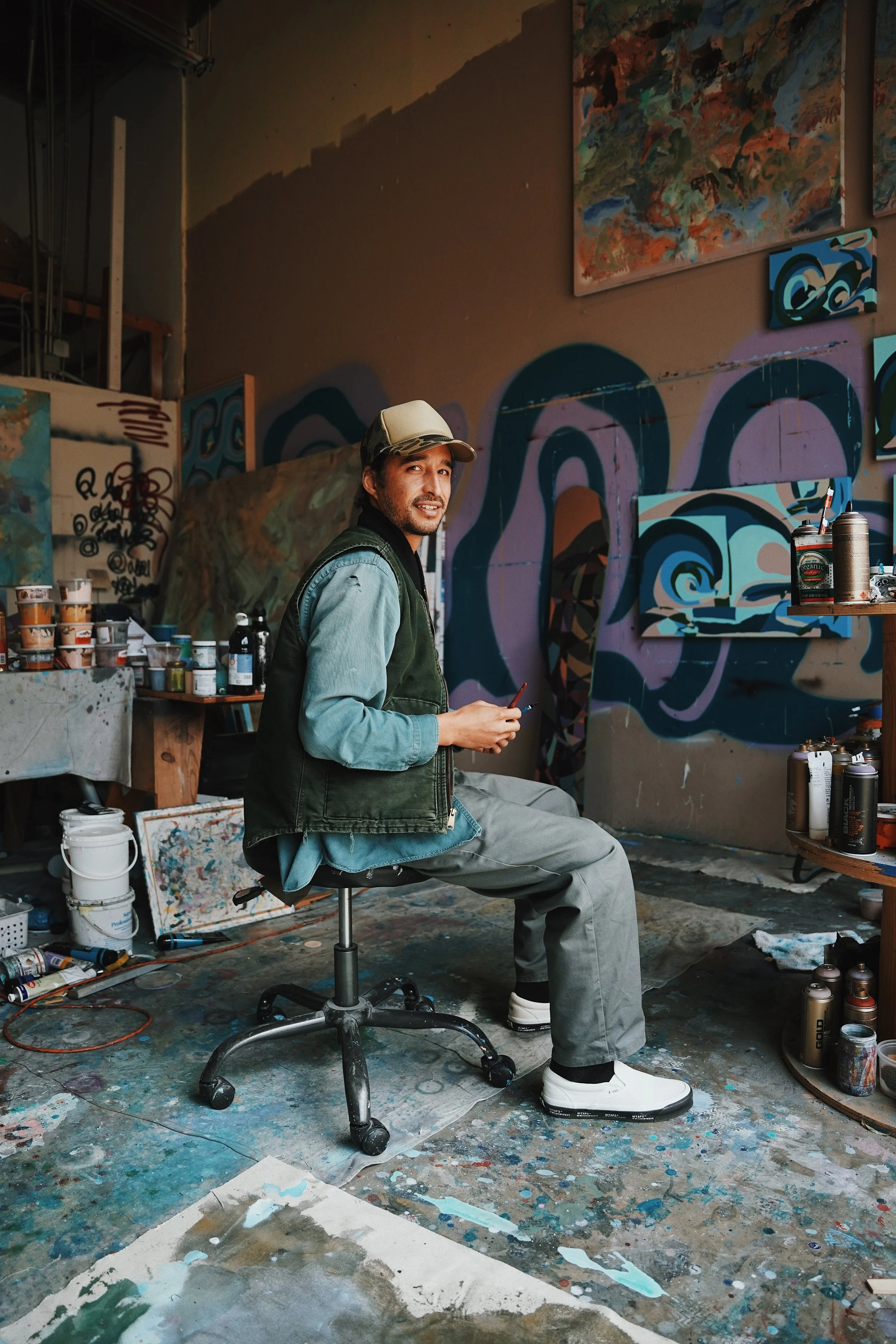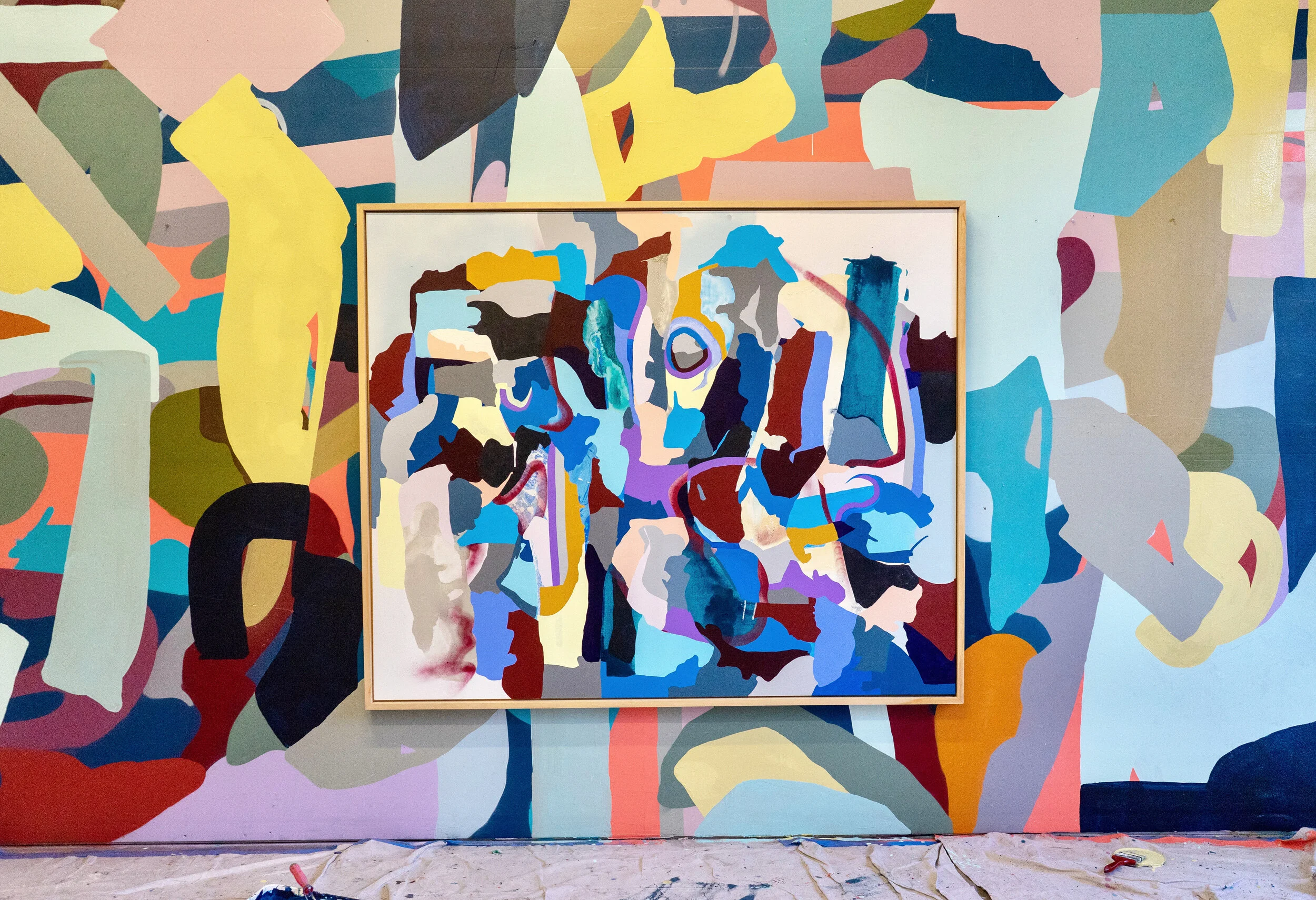Acrylic, acrylic marker, and spray paint on stretched canvas.